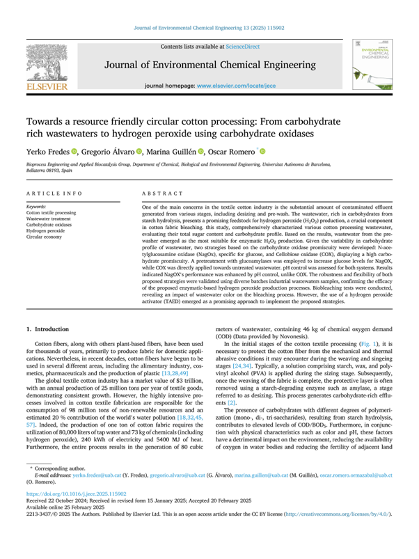 The OXIPRO team is pleased to share a ground-breaking new publication from researchers at the Bioprocess Engineering and Applied Biocatalysis Group, Universitat Autònoma de Barcelona (UAB). The study, led by Yerko Fredes, Gregorio Álvaro, Marina Guillén, and Oscar Romero, explores an innovative enzymatic approach to reduce environmental impact in the textile industry. The article, titled “Towards a resource-friendly circular cotton processing: From carbohydrate-rich wastewaters to hydrogen peroxide using carbohydrate oxidases”, is now available in the Journal of Environmental Chemical Engineering.