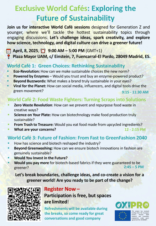 Are you ready to rethink sustainability and challenge the status quo? Join us for a day of dynamic, interactive discussions at the OXIPRO World Café event in Madrid! Designed for Generation Z and younger, this unique gathering will explore how science and technology can shape a greener future. Expect thought-provoking conversations, fresh ideas, and real-world impact—all in a relaxed, engaging setting.